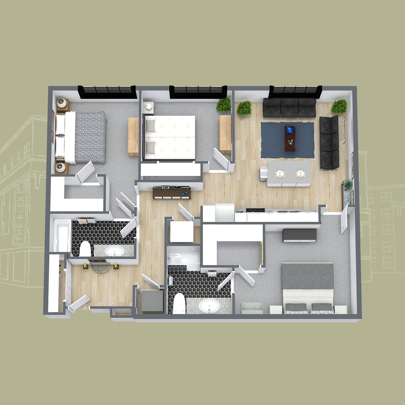 2 Bedrooms + 2 Bathrooms: